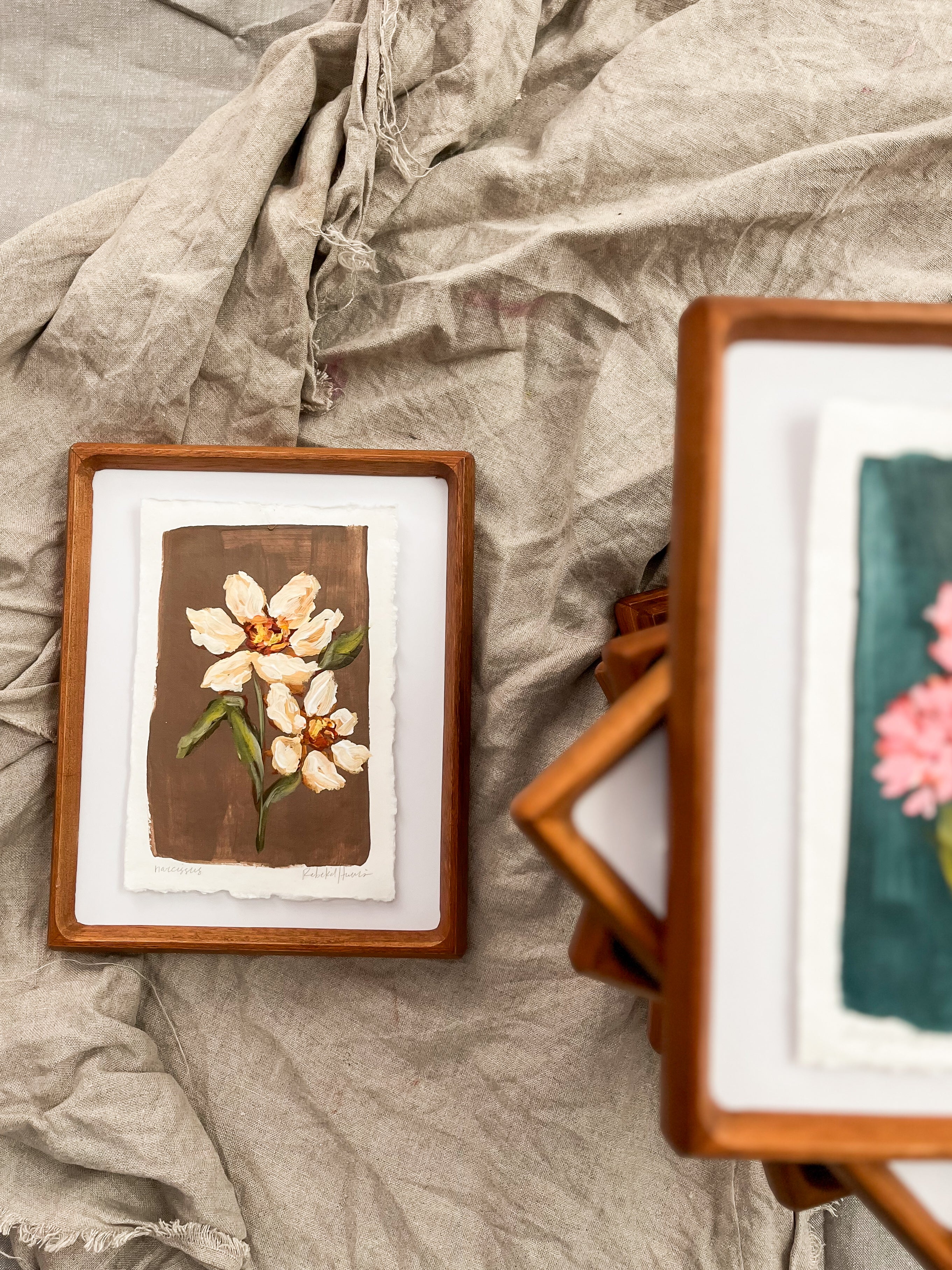 The Framed Birth Flower CollectionInspired by the flower that represents each month, these original mini florals are painted on handmade cotton paper, mounted on board, and beautifully showcased in a warm walnut frame.I’ve chosen not to place them behind glass so you can fully admire the texture and originality of each piece — and I love how they turned out.Each one is a meaningful, one-of-a-kind work of art. I can’t wait to see where you choose to display yours.