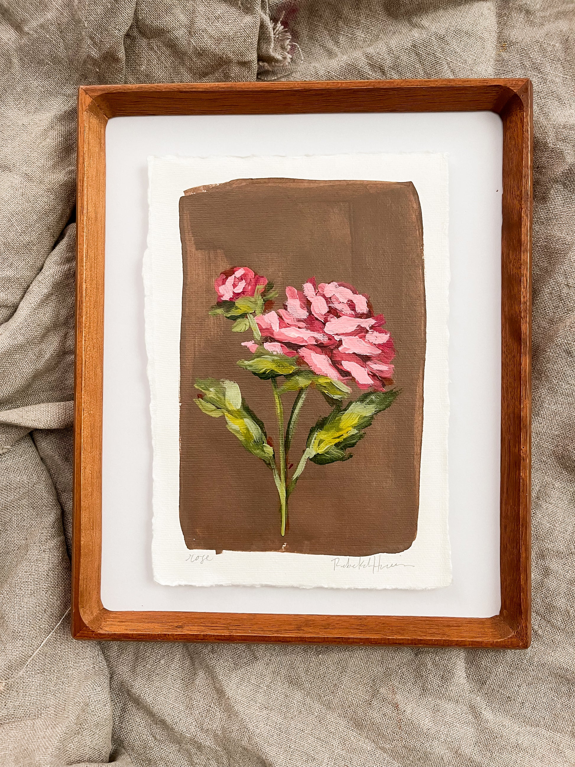 Each piece is an original floral painting — sweet, meaningful, and one of a kind. Mounted on board and framed in rich walnut, ready to bring a touch of beauty to your space.