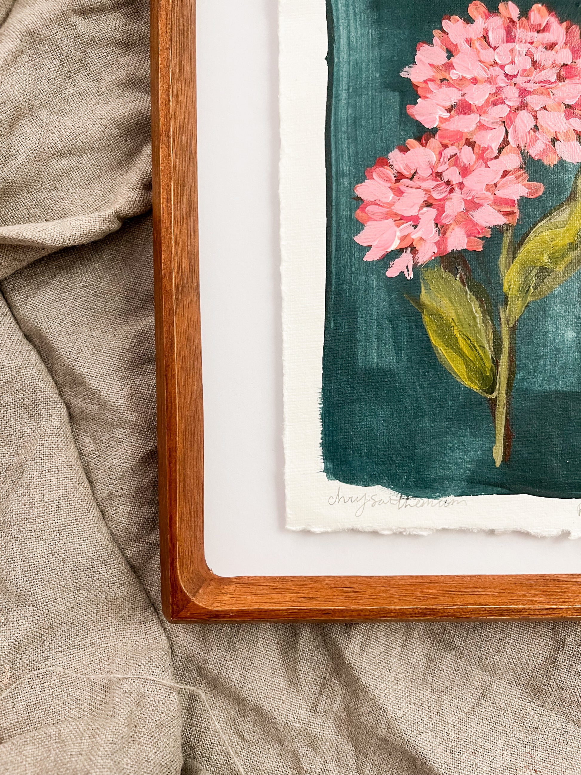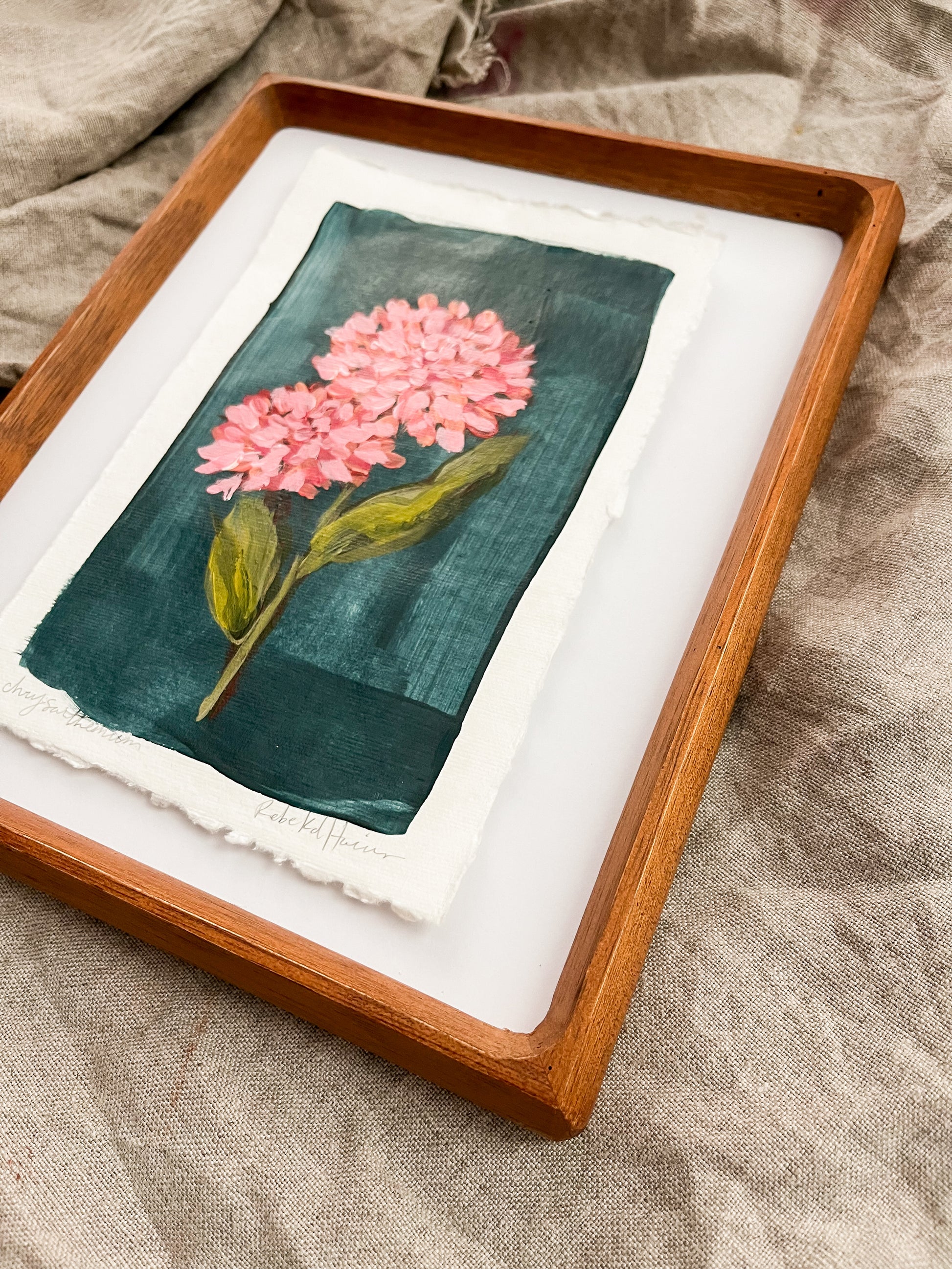 Each piece is an original floral painting — sweet, meaningful, and one of a kind. Mounted on board and framed in rich walnut, ready to bring a touch of beauty to your space.