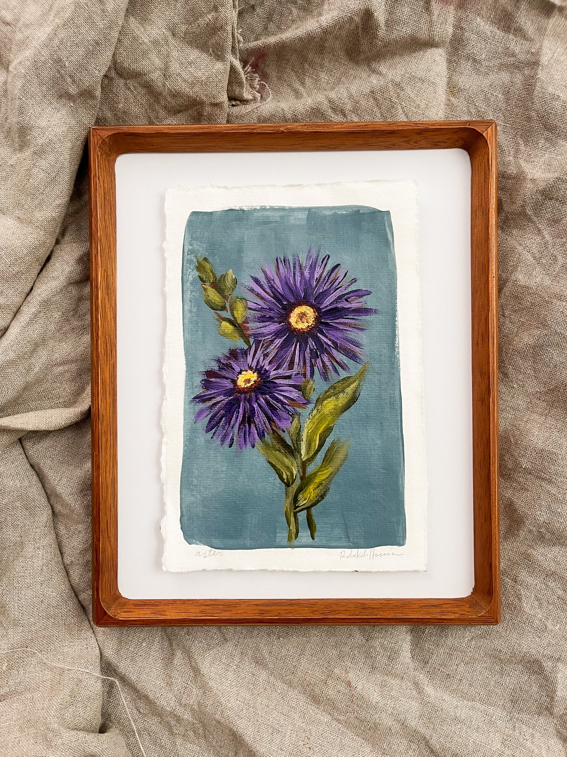Each piece is an original floral painting — sweet, meaningful, and one of a kind. Mounted on board and framed in rich walnut, ready to bring a touch of beauty to your space.