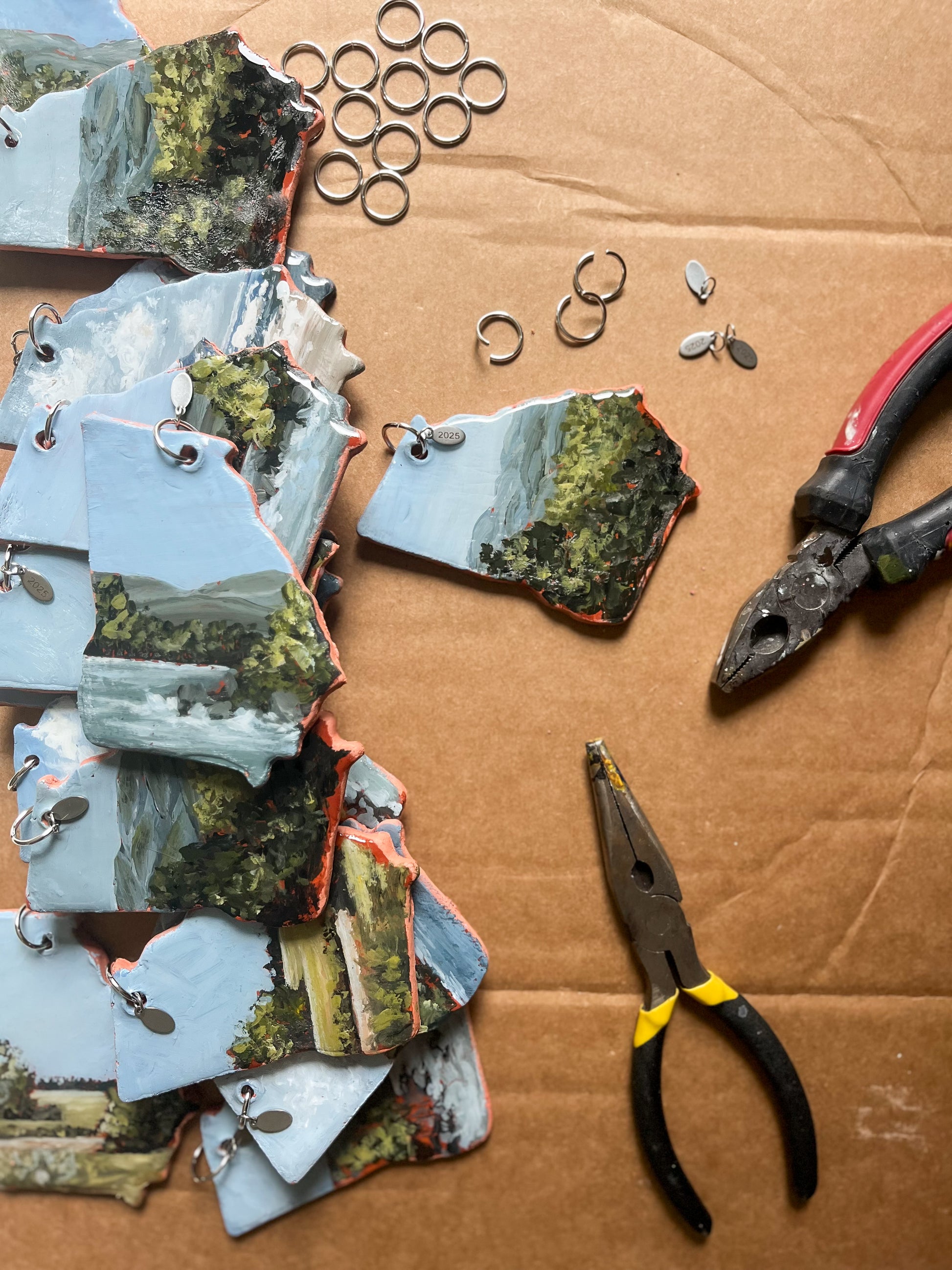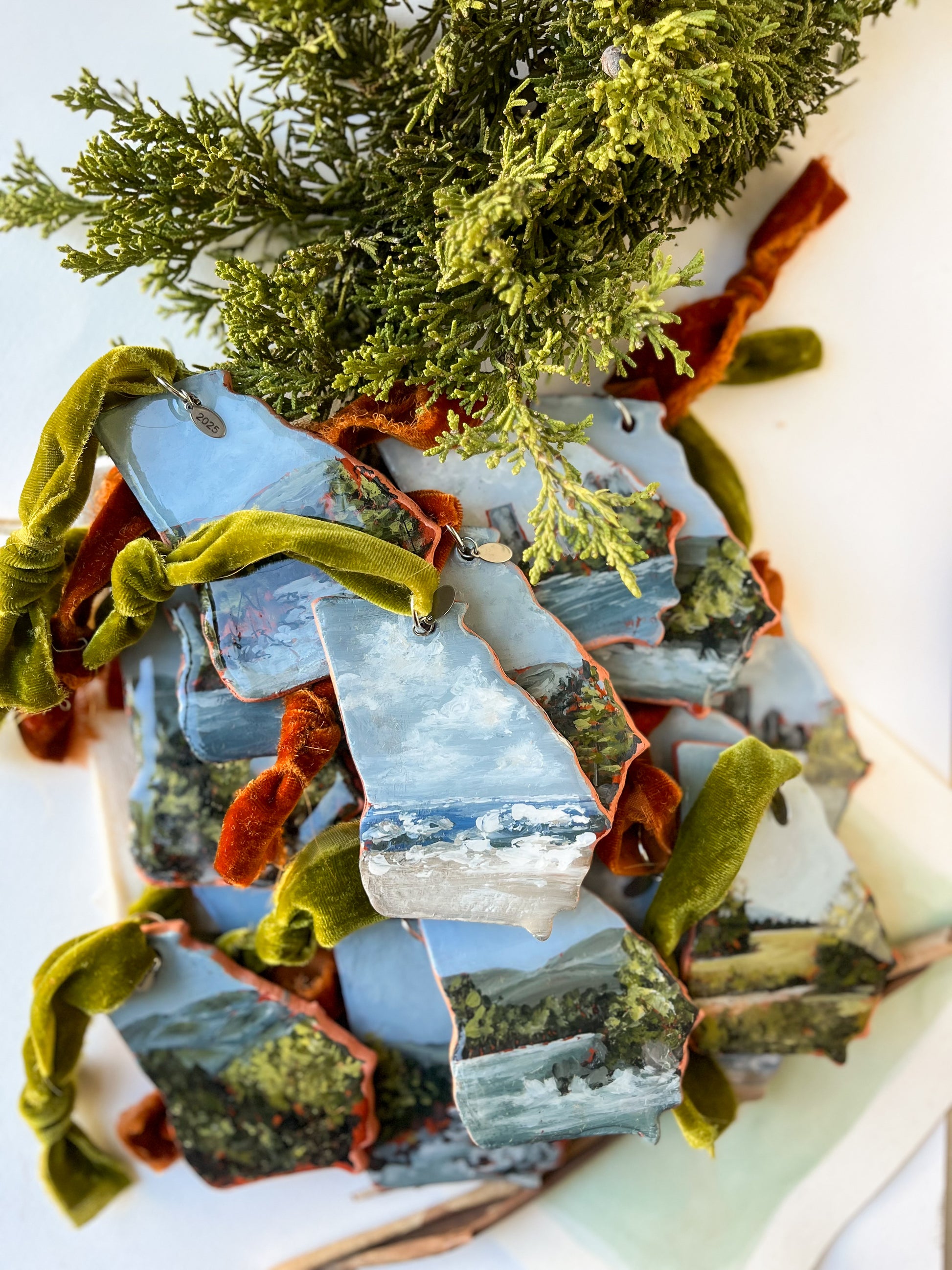 Every clay ornament is handmade and hand-painted by artist Rebekah Harrison, signed and stamped with the year on the back, sealed in resin, and finished with silver date charm and a soft velvet ribbon.