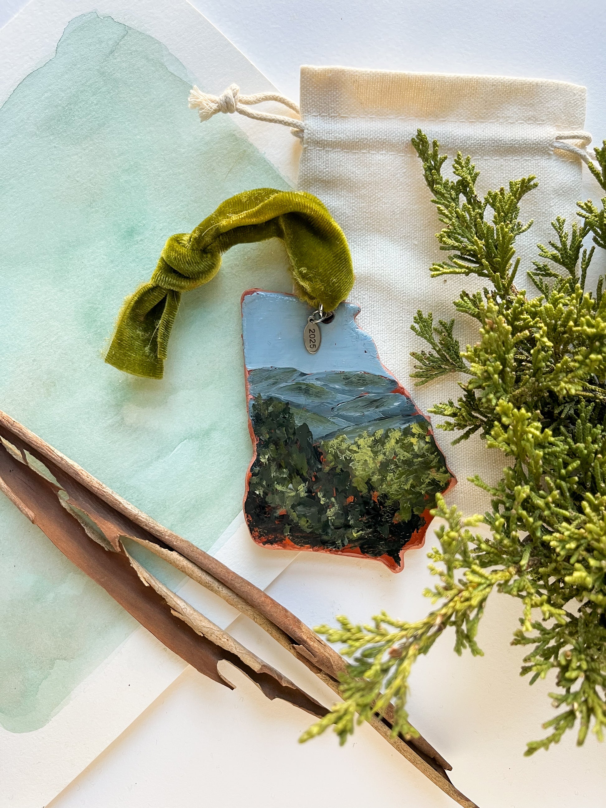 Every clay ornament is handmade and hand-painted by artist Rebekah Harrison, signed and stamped with the year on the back, sealed in resin, and finished with silver date charm and a soft velvet ribbon.